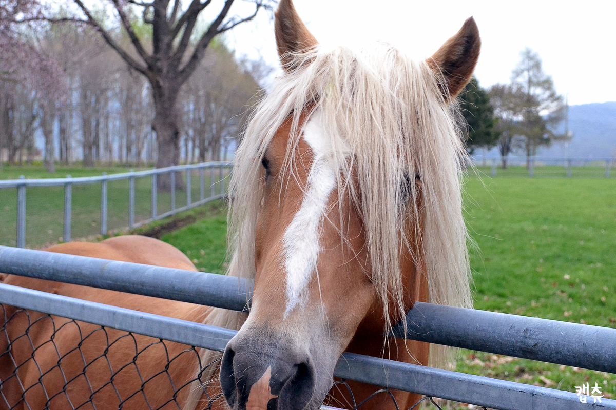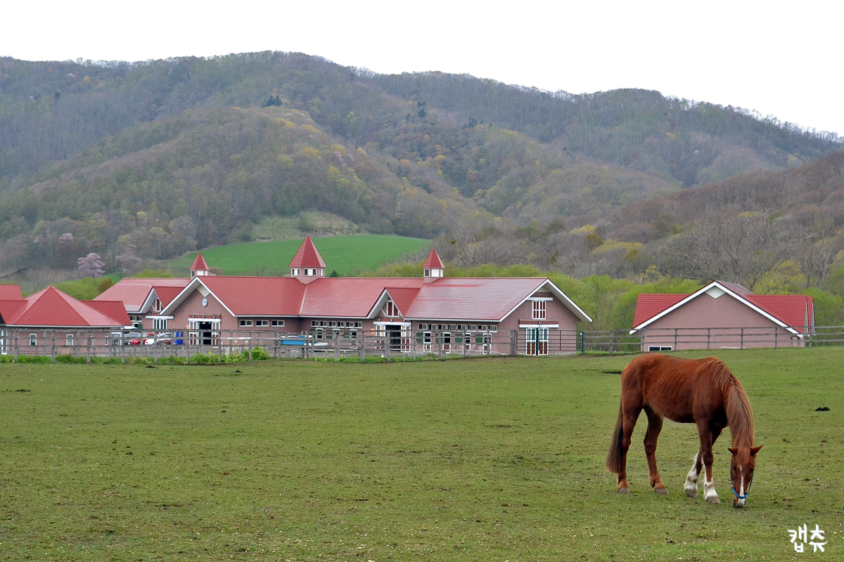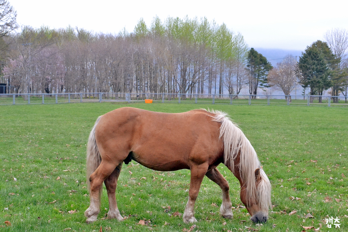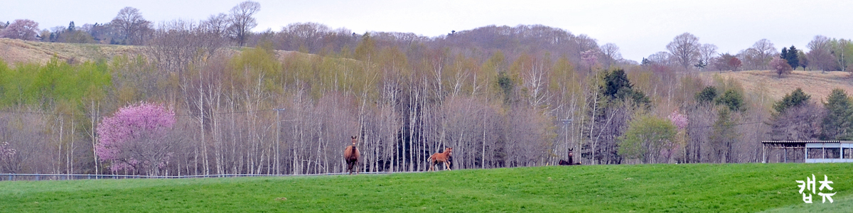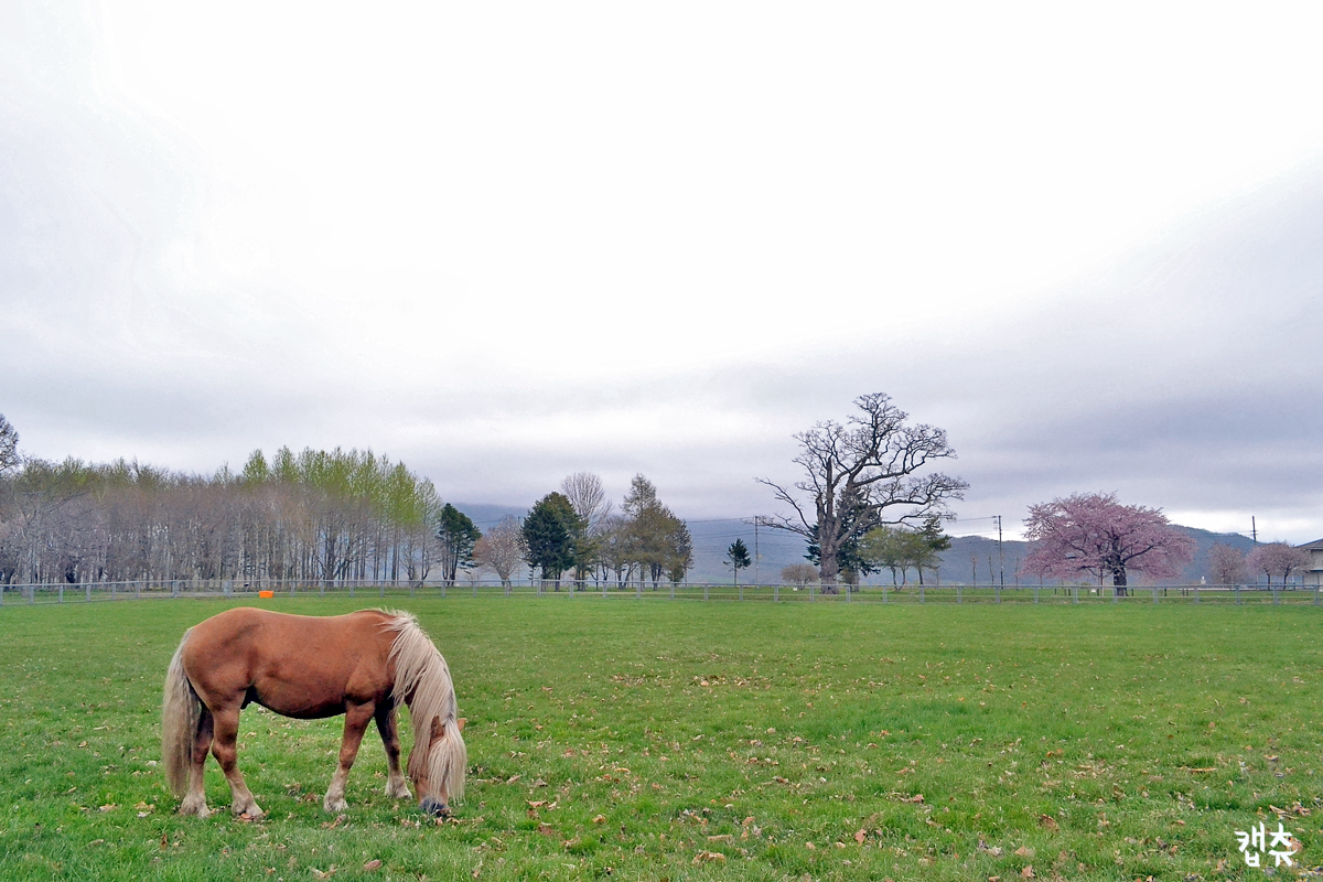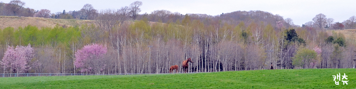 또 목장 주위에 흔하게 볼 수 있었던 에조야마벚꽃나무(홋카이도 야생 산벚나무)를 가져다 심어서 봄이 되면 벚꽃, 말, 초원의 조합이 빛을 발한다.
