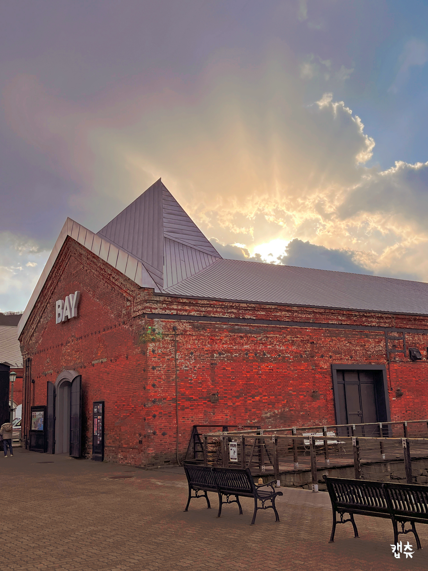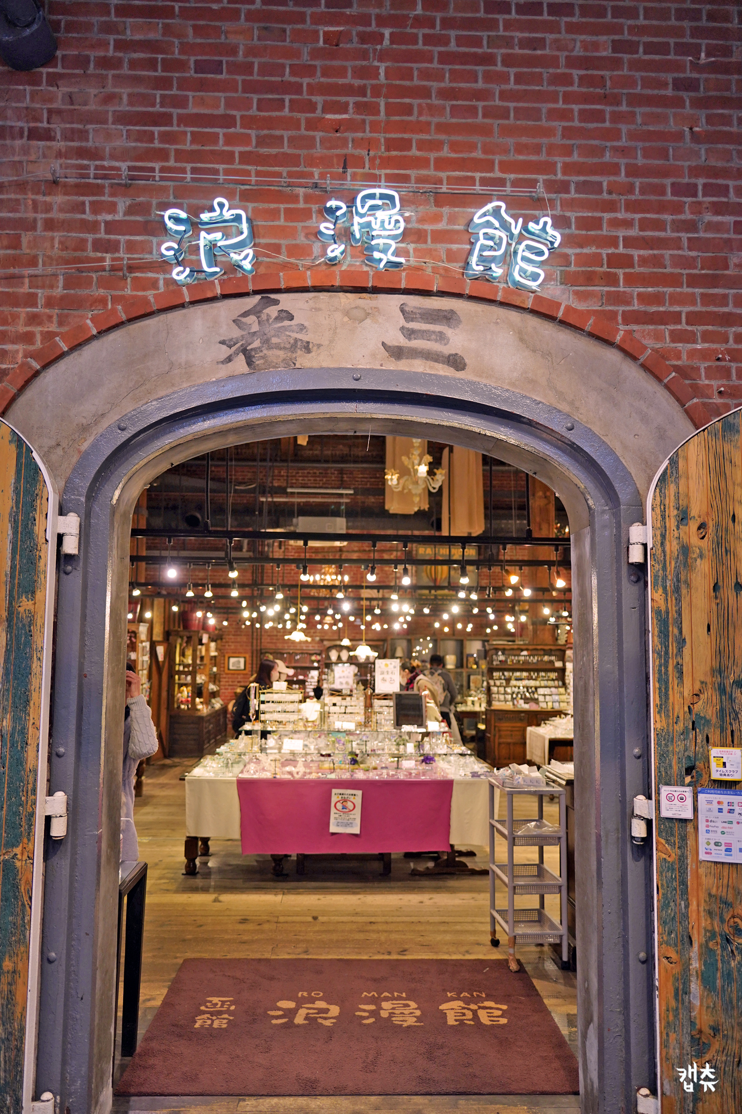 아치 모양 시치자이바시(七財橋)를 건너면 창고 전면부가 나란히 늘어서 있는데 이 부분의 벽돌은 비교적 깔끔해 보인다. 측면으로 돌아가서 보면 세월이 고스란히 벽돌에 쌓여 있다. 저녁에 보면 전구색 조명을 켜두고 창문 틈새로는 은은한 빛이 새어 나와 빈티지한 벽돌의 오래된 분위기가 한층 더 돋보인다.
